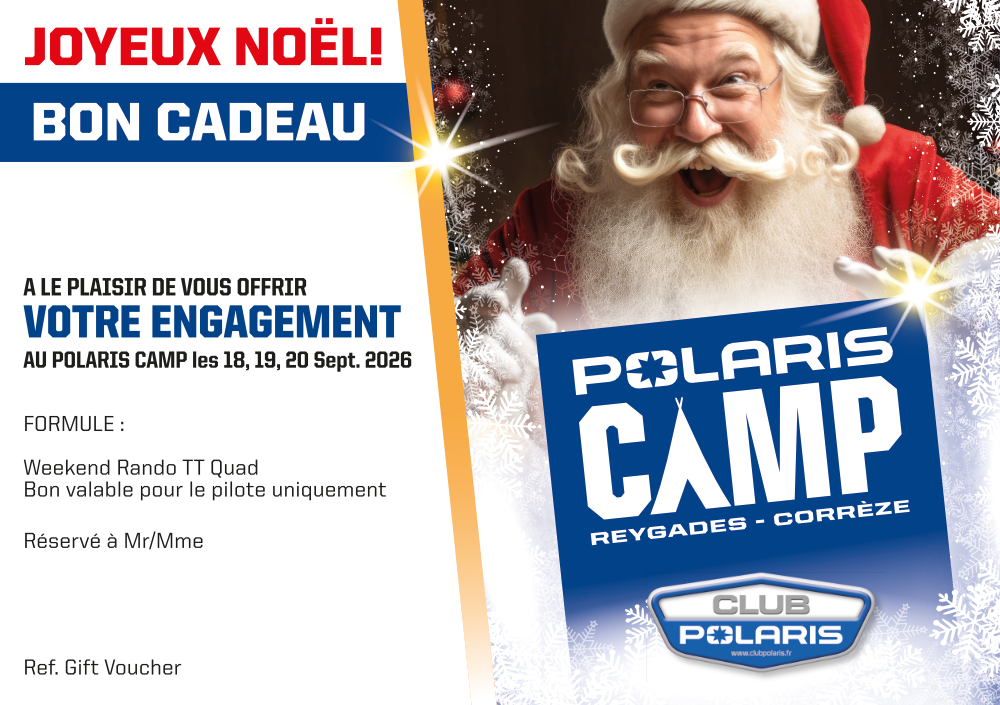 Bon cadeau valable pour une l’inscription d’un pilote sur une formule weekend Rando TT Quad au Polaris Camp 2026.